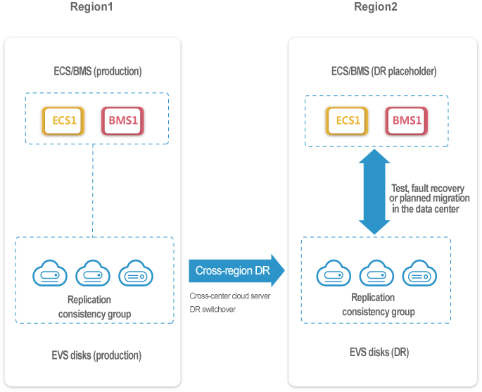 When the production center malfunctions due to a power outage, fire, or another disaster, a DR administrator can perform fault migration on ECSs/BMSs by one click to fast recover ECSs/BMSs to a DR center, minimizing impacts on services.